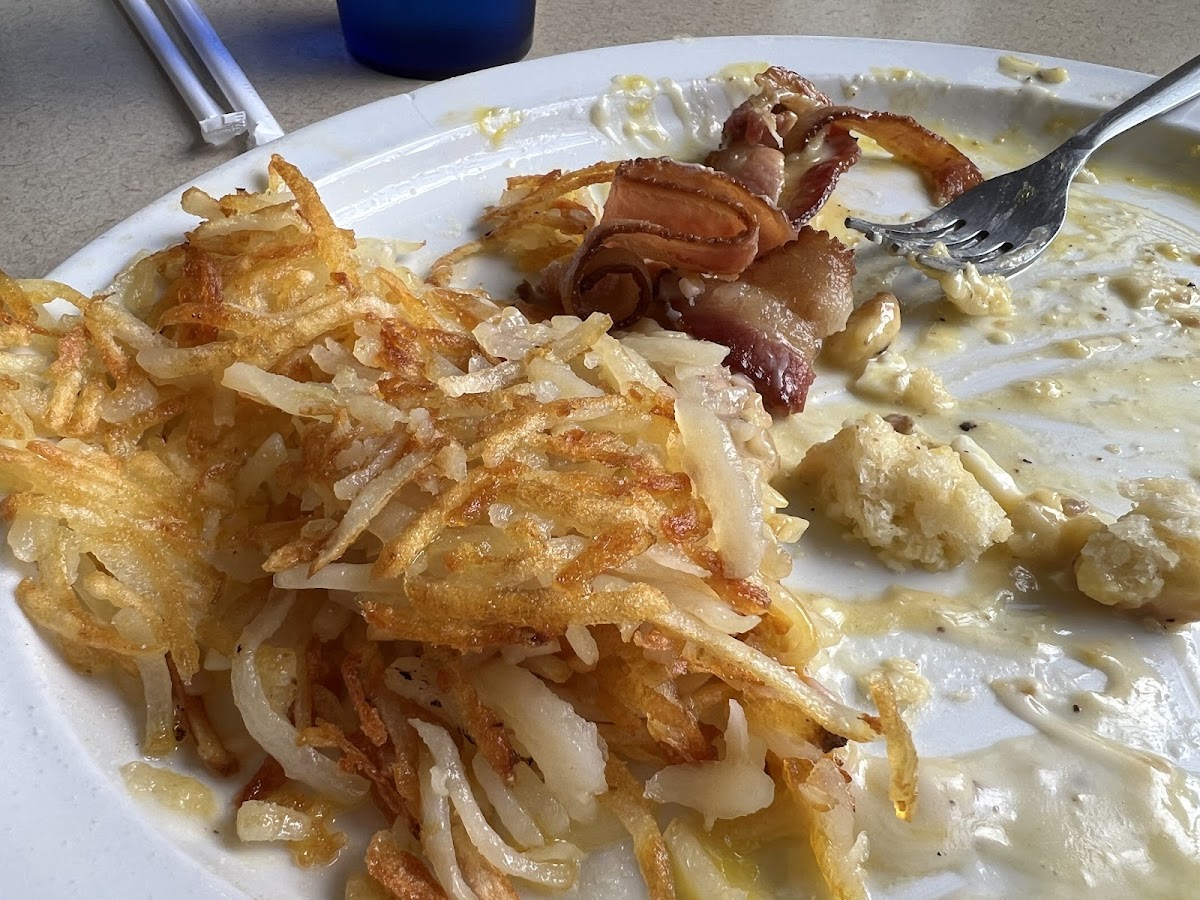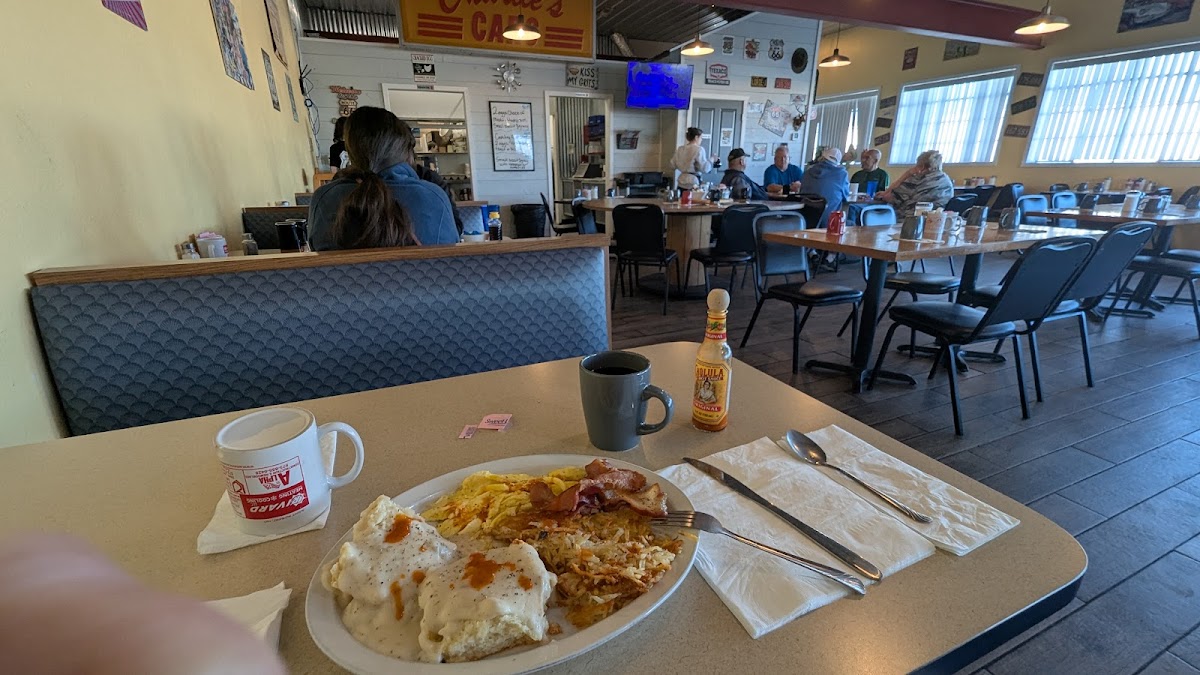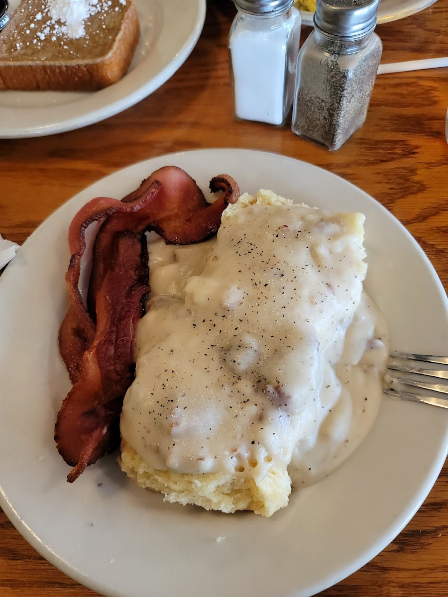 Very cosy local diner along Route 66 in Waynesville, MO. We went for breakfast, which said was only served till 10:45am, and got basic eggs dishes. I got the special two eggs choice of meat hashbrowns and biscuits and gravy. I got the sausage patties for my meat which were delicious. Crispy on the outside but tasty on the inside. The biscuits and gravy were the star of the show though. The biscuits were nice and fluffy and the gravy was very tasty and not lumpy. Highly recommend that. Nice big portion for under $11. Got the two eggs hashbrowns and bacon. She can be picky about the bacon but had nothing but praises for the thick cuts she got. Highly recommend.